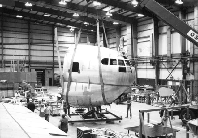 In this picture we see the original 377/C-97 cockpit section in the process of being mated to