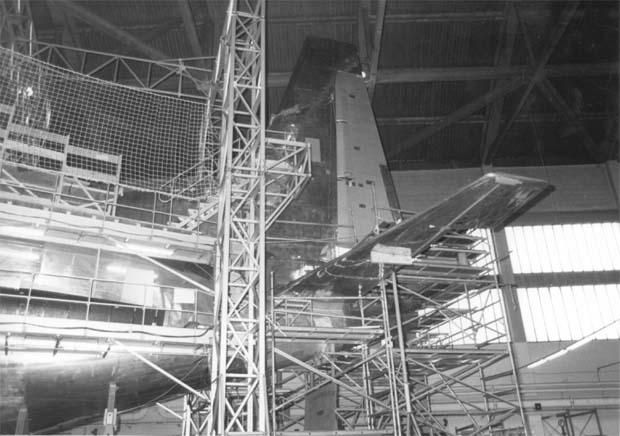 scaffolding will later be rearranged for final fitting of the nose section to the rear portion