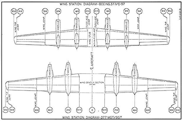 the lengthening of the fuselage. Notice the numbered fuselage sections in the 377/C-97 drawing.